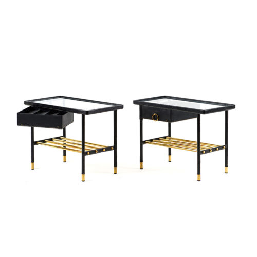 Paire de chevets à structure et métal partiellement gainée de cuir noir piqué sellier; éléments en laiton.